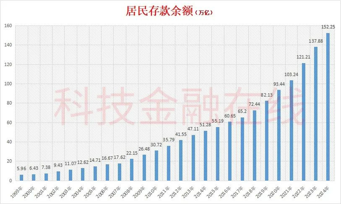 根据中国人民银行此前公布的数据,到2024年12月,国内存款类金融机构居民存款余额152.25万亿,增长10.42%。其中活期存款41.82万亿,增长6.09%,定期存款110.44万亿,增长12.17%。