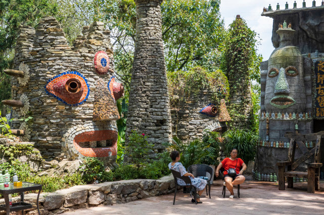 夜郎谷里到处是奇异夸张的石头人像造型,据说是根据贵州当地的傩戏面具打造的,用的材料都是石头、破陶瓷片、建筑垃圾等,废物利用,发挥自己的艺术想象力,创造了这些作品。如今,宋培伦将夜郎谷无偿捐赠给了当地的一所学校。