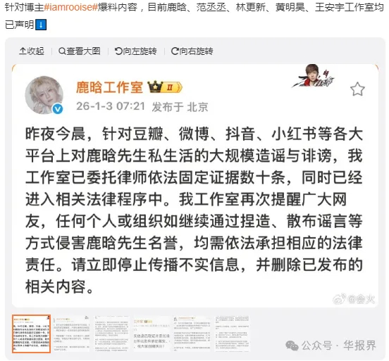 ✅ 第一波回应(1月3日凌晨):率先发文澄清,明确表示“各平台涉及鹿晗先生的所有不实信息,均已依法完成证据固定,并委托律师启动相应法律程序”,直接把“维权”的信号拉满,给谣言泼了第一盆冷水。