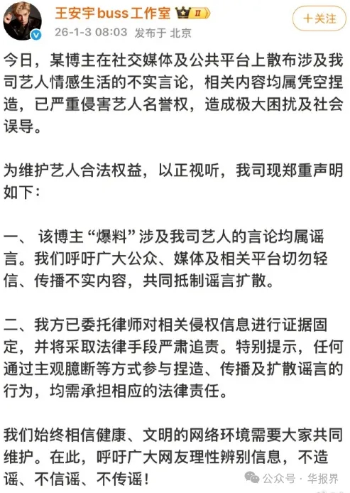 ✅ 第二波回应(1月3日早晨):再次加码声明,详细说明“已固定数十条造谣证据”,强调“造谣行为已构成诽谤”,并严肃提醒“任何个人或组织继续传播不实信息,均需依法承担相应法律责任”,同时呼吁网友“立即删除相关内容”,态度强硬且明确。