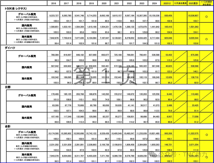 历史最高销量纪录!丰田正式公布2025年成绩单:全球销量达到11,322,575辆,同比增长4.6%,其中丰田品牌(含雷克萨斯)销量10,536,807辆,同比增长3.7%。丰田已经连续6年保持全球销量第一的产销量规模,并扩大了对大众汽车的领先优势,差距达到233万辆。