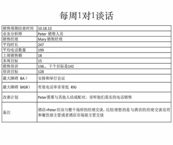 25. 每周进行一对一谈话。针对销售员的谈话和指导,要有明确的格式范例。一来让谈话更有效率,目的更明确,二来对新任经理也很有用,能帮助他们控制对话节奏。