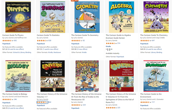 戈尼克将The Cartoon Guide打造成一个横跨数理化的漫画宇宙,系列涵盖数学、宇宙史、经济学、环境科学等18个领域,成为英语世界科普漫画图书的标杆。其中《漫画宇宙历史》出版三十余年仍稳居亚马逊历史类图书TOP50,见证其持久生命力。他的创作赢得国际双重认证:哈维奖(《漫画宇宙历史》)与墨点奖(《漫画生物学》)肯定其艺术创意,而读者口碑则印证了“笑着学习”的可能。此外,《漫画微积分》被美国数学协会推荐,《漫画经济学指南》作为常春藤院校通识参考书,并受到财经媒体年度书单推荐。The Cartoon Guide系列被翻译成20余种语言,全球销量超百万册。