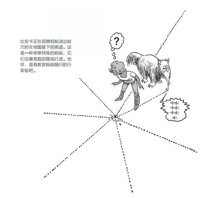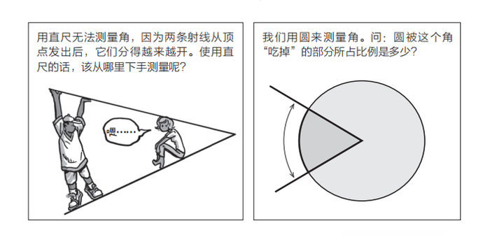 传统教辅用文字定义,但是要学习的概念太多,需要反复背诵加深记忆;而《漫画几何学》则更多地用图形示例和比喻帮助理解,轻松记忆。例如,关于“角”,书本上的定义是“角是从一点引出两条射线所组成的图形”,《漫画几何学》中,第5章用漫画人物比安卡对蚂蚁的行进轨迹做漫画展示,比安卡观察到“不同路线上的两只蚂蚁到蚁穴的距离可能相等,而同一条路线上的两只蚂蚁到蚁穴的距离可能不同”,由此引入“角”和“角的度量”的知识点。这种具象化表达,让孩子对“角的度量”的理解比硬背定义要容易得多,也深刻得多。