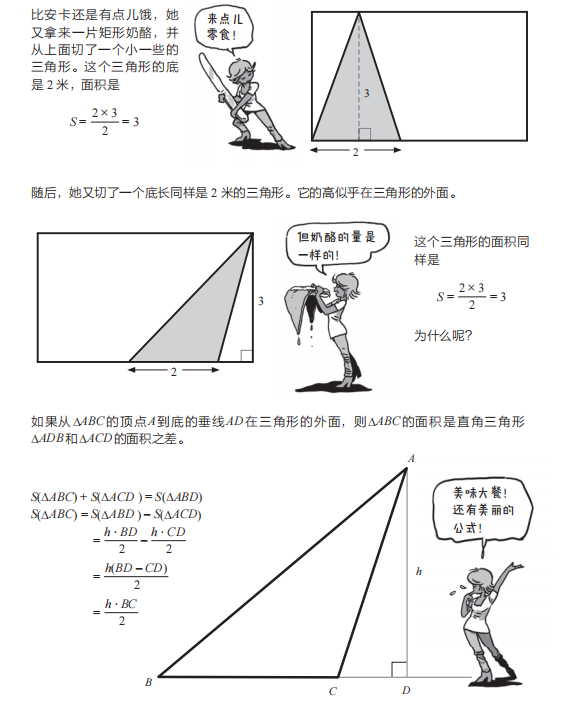 在《漫画几何学》第13章“面积”中,拉里・戈尼克用“奶酪拼图”帮助理解:三个漫画人物分别用刀从三块矩形奶酪上切下三个形状不同但面积相等的三角形,直观展示“三角形面积是等底等高矩形的一半”,并通过不同三角形的切法继续佐证三角形面积定理。