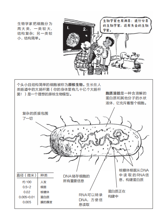 讲到原核生物,他说:DNA是“指导手册”,RNA和核糖体、膜,以及胞质溶胶阅读手册,以上这些组成了一套最基本的“细胞设备”,即“原核生物”。