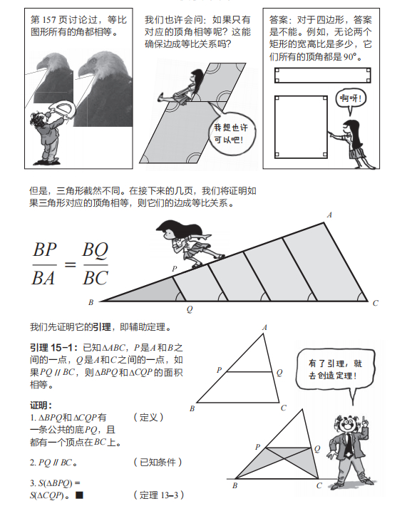 如何证明相似?如何证明平行?这些常常让刚开始接触证明题的孩子感到崩溃,书中第15章先用照片的放大与缩小来引入相似、比例的概念,进而从线段到矩形再到三角形,逐层深入地解释,最后给出实际应用,让“同位角相等,两直线平行”的定理变成可感知的生活常识与工具。