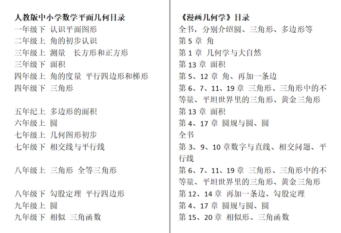 人教版中小学平面几何围绕“图形认识—度量计算—逻辑推理”展开,而《漫画几何学》以“历史脉络+趣味案例+练习巩固”重构知识框架,二者核心内容高度重合,小学初中需要学习的平面几何知识,一本书讲透!