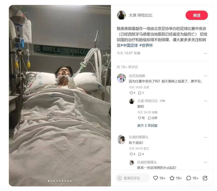郭嘉璇亲友在网络发帖 图源:网络截图在2月11下午发布的该篇帖文中,名为“大琪呀哈比比”的网友自称是郭嘉璇的哥哥。据他自述,郭嘉璇在西班牙集训期间(2025年2月6日),在一场和西班牙RC阿尔科文达斯足球俱乐部球队的比赛过程中,奋不顾身铲球时被对方球员的膝盖击中头部昏迷,被紧急送到马德里的一家医院进行急救,当时诊断颅内出血过多,生命受到严重威胁。在家人抵达西班牙后,郭嘉璇已被西班牙医院认定为脑死亡。家人期望把郭嘉璇运回国内抢救,但没有得到北京足协和国安俱乐部的后续承诺。