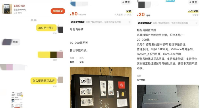 代购们一来二去无形间推高了吊牌的价格,但实际上在“台州鸟”(仿制始祖鸟的代称)泛滥的市场里,不少商家用“顶”来形容自己手里的货。因此知名平台潮牌鉴定师Ye神推测:“买卖吊牌或许是海淘们为通过审核,但用来造假仿制和方便二手衣服售卖的可能性应该更高,或许商家还会拿真吊牌的‘台州鸟’浑水摸鱼售卖。”