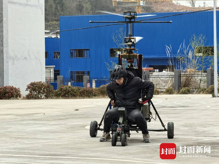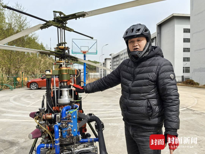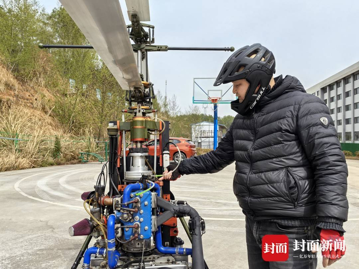 记者注意到,该飞机高1米8,宽1米2。“我这款属于超轻型单人单座共轴双桨直升机,重115公斤,每次只能加18升油。”说罢,他往油箱里加了一壶油后,便将飞机推到了篮球场上。
