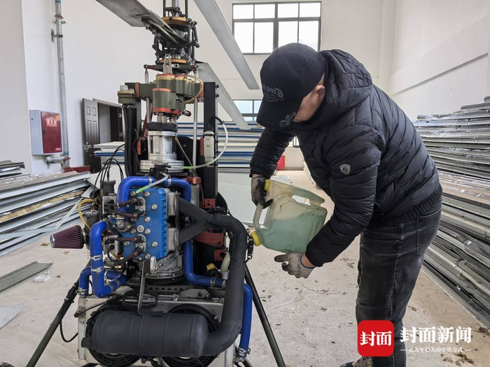唐正兴给直升机加油。刘彦谷摄唐正兴说,去年夏天,他得知四川广安一男子要出售一款超轻型单人单座共轴双桨直升机,他心动不已,通过双方协商,最终花了20多万元购买了这架“二手”的飞机,而后,自己又花了15万元更换了飞机的部分零件。