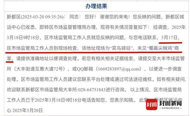 在李女士提供的12345热线回复的工单上,记者看到,3月17日,新都区市场监管局工作人员到现场检查,该地址现场为“菜鸟驿站”,未见“蜀赢尖椒鸡”商家,请提供准确地位以便调查处理。