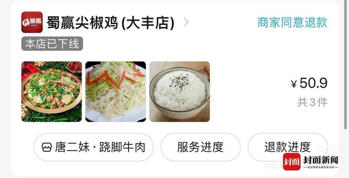 涉事外卖店已经下架同时,李女士告诉记者,涉事的这家“蜀赢尖椒鸡”(大丰店)已经下架,无法再次取得联系。
