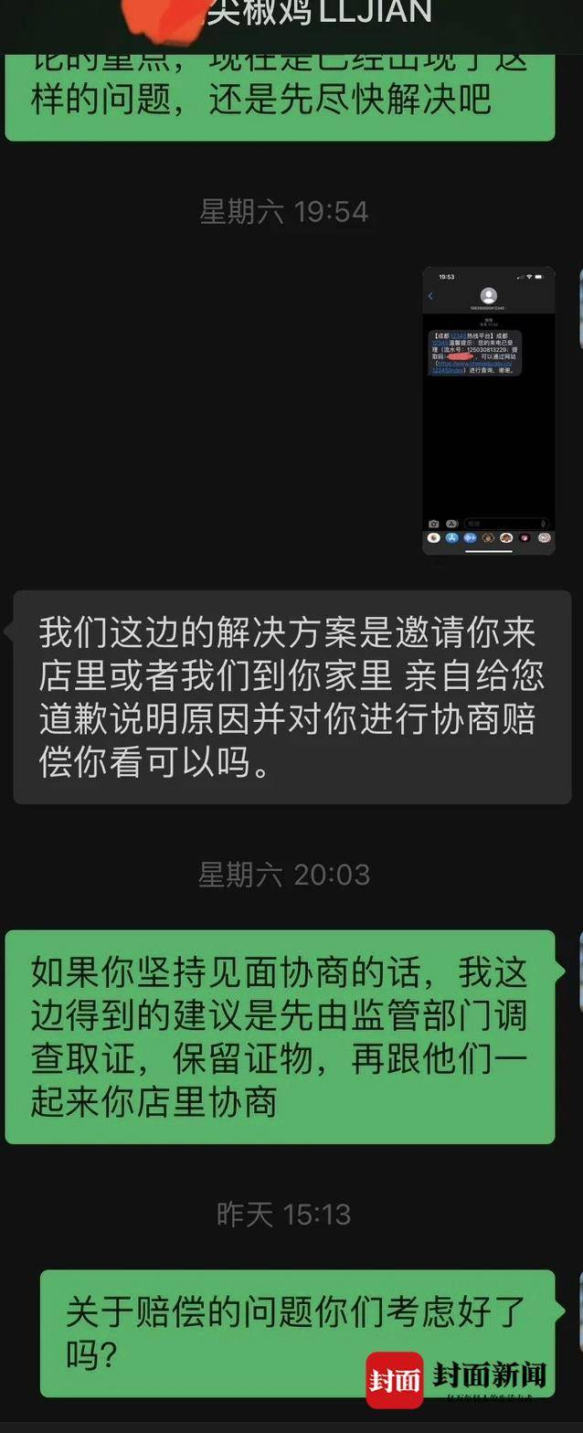 起初,外卖店积极与李女士沟通,加了她微信,并表示愿意进行处理。“我们的解决方案是邀请你来店里或者是我们到你家里,亲自道歉说明原因并对你进行协商赔偿。”外卖店在微信上表示。