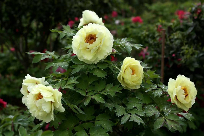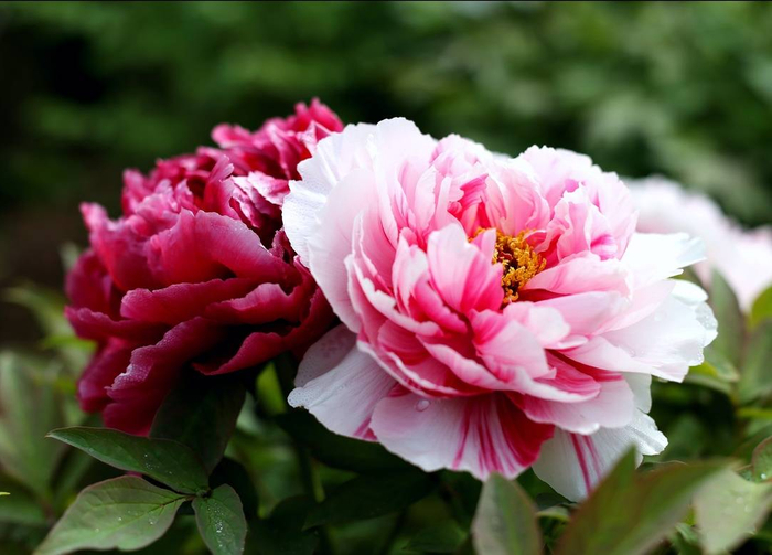 同一株上同时开出两种颜色的是“二乔”。 花红白或粉白相间的,是“岛锦”,花朵直径可达18厘米,如红霞织就的锦缎。花色厚重温润、红得发紫的,是“珠光墨润”,是一种中花期品种,可以在四月中下旬观赏。而远看如绣球花,近看似卷心菜的,则是“绿幕”,是一种绿色牡丹。