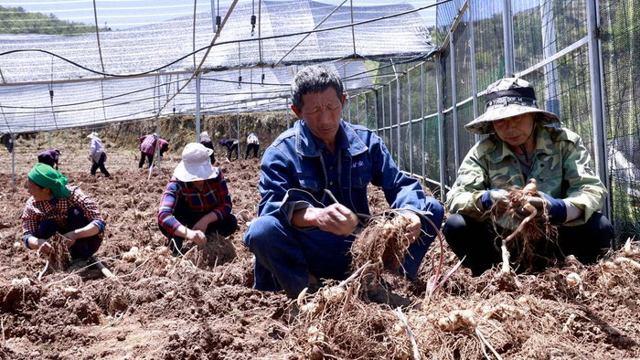6月,四川凉山州金阳县南瓦镇丝窝中心村中药材现代农业产业园区,中药材滇黄精开挖,村民们迎来丰收时刻。