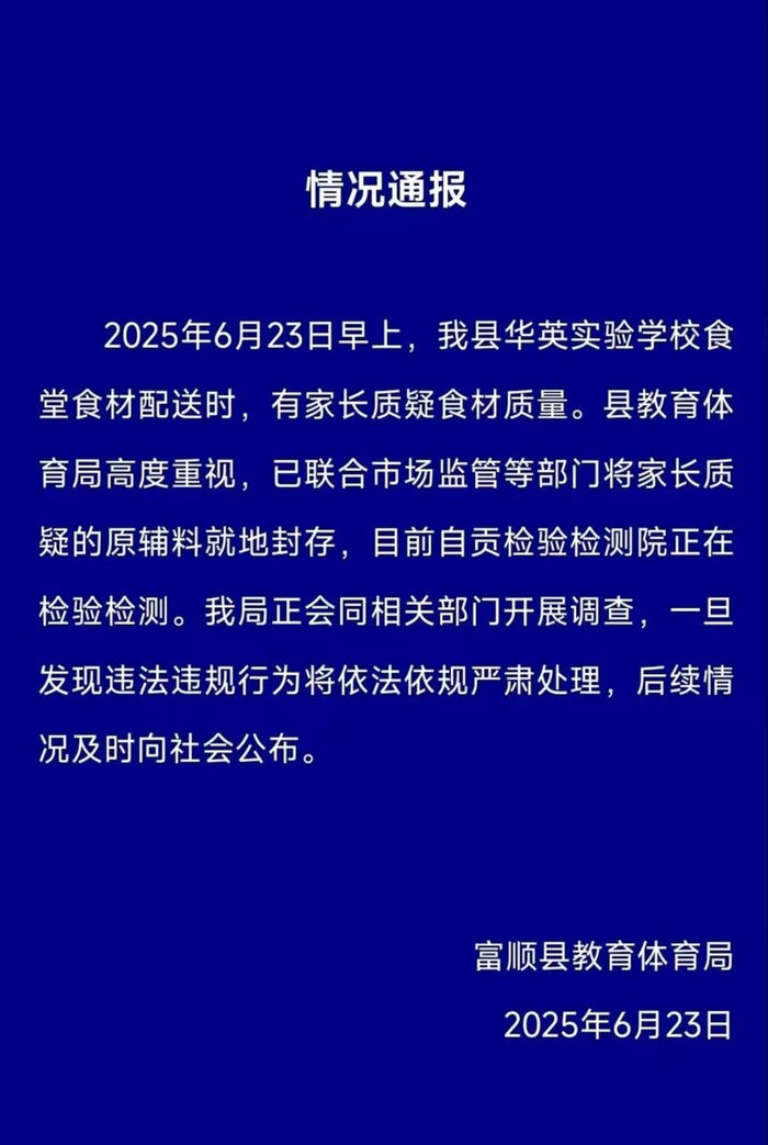 情况通报通报提到,2025年6月23日早上,富顺县华英实验学校食堂食材配送时,有家长质疑食材质量。县教育体育局高度重视,已联合市场监管等部门将家长质疑的原辅料就地封存,目前自贡检验检测院正在检验检测。