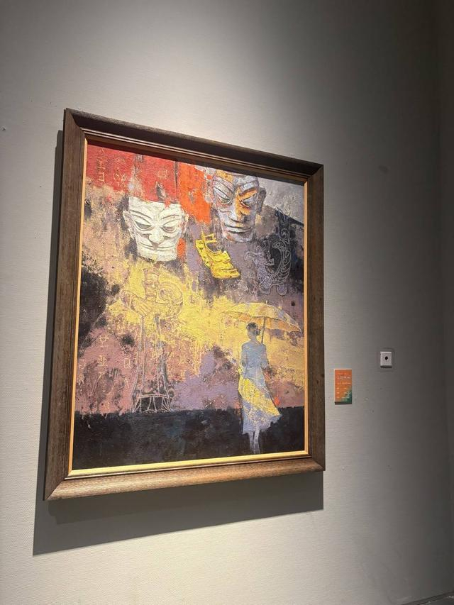 尤其在“古蜀文脉·千年回响”单元中,三星堆、金沙、川剧等标志性文化符号以油画语言重新诠释。房树军的《追溯》描绘了一位撑伞女子的背影,面对栩栩如生的青铜面具与青铜大立人像,仿佛在进行一场跨越千年的对话;赵学超的《粉墨光年》则捕捉了川剧舞台上的流光溢彩,将传统戏曲的韵味凝固于画布之上。