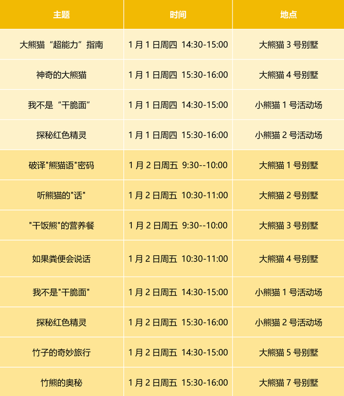 元旦小长假,计划打卡成都大熊猫繁育研究基地的朋友们注意啦。封面新闻记者从成都大熊猫繁育研究基地获悉,为迎接元旦假期,基地准备了熊猫科普等“限定”活动。