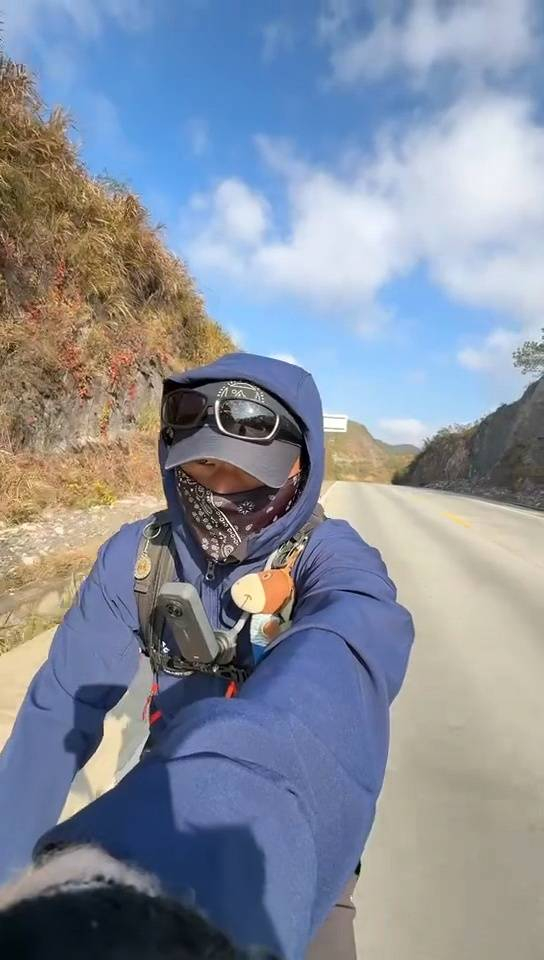 正在骑行的安先生。谈起旅途,安先生直言整体还算顺利,只有出发初期久坐骑行,让他饱受屁股酸痛的困扰,不过作为徒步爱好者,充沛的体能为他的长途骑行提供了支撑。
