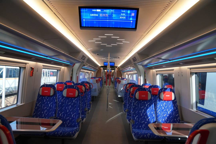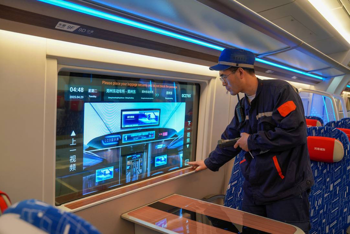 CRH3A-A型动车组车厢内部“旅客可以根据需求选择观看视频,也可以点击‘车窗切换’按钮控制车窗进光模式,欣赏窗外风景,沉浸式享受人机交互模式,增加旅途的趣味性。”他说。