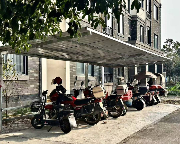 图为仁寿新居新车棚仁寿新居是一个典型的乡村集中居住区,目前集中安置了850户村民,居民中“一老一小”占比高,电动自行车是许多家庭出行的主要工具。然而,小区资源有限,长期面临充电设施、停车棚数量短缺的困境,导致“飞线充电”、私拉乱接现象屡禁不止,不仅影响小区环境,更埋下严重的消防安全隐患。