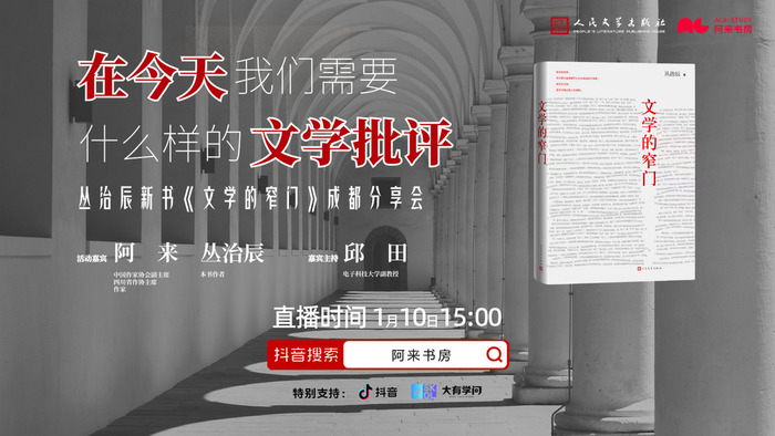 在这个信息纷繁、知识爆炸的时代,我们该如何阅读、如何理解一部新的作品,评论家又该如何在文本的肌理与时代的脉搏之间,建立起有温度的连接?1月10日下午3:00,评论家丛治辰将携其全新文学评论集《文学的窄门》来到阿来书房,与著名作家阿来展开一场关于文学、批评与时代的深度对谈。电子科技大学副教授邱田将担任学术主持。