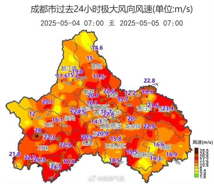 据成都市气象台的实况数据,成都全市普遍出现7-8级阵性大风,局部地方9-10级,最大风速在邛崃大同陶坝,达28.0m/s,相当于10级风。