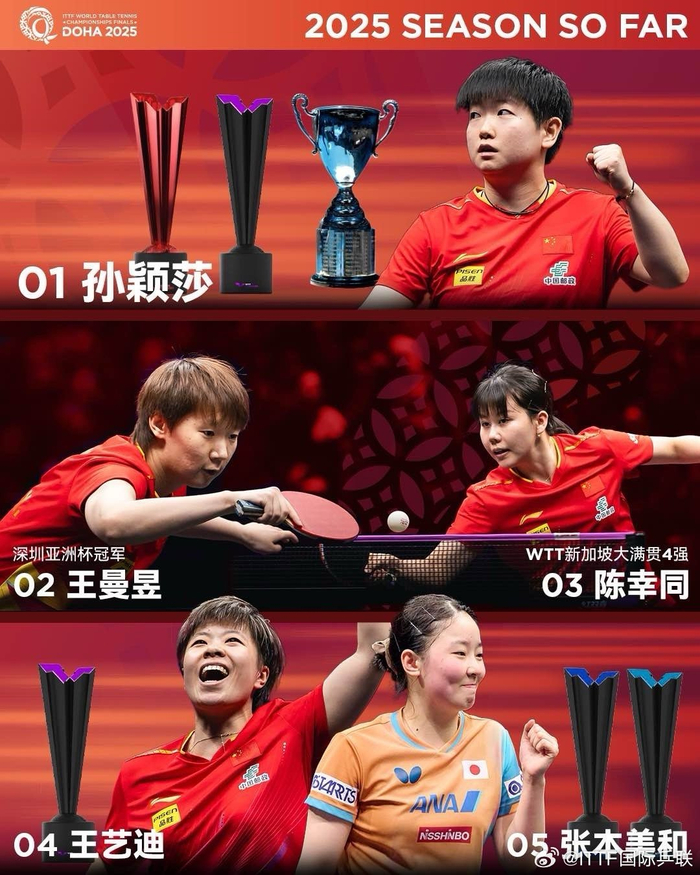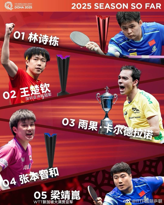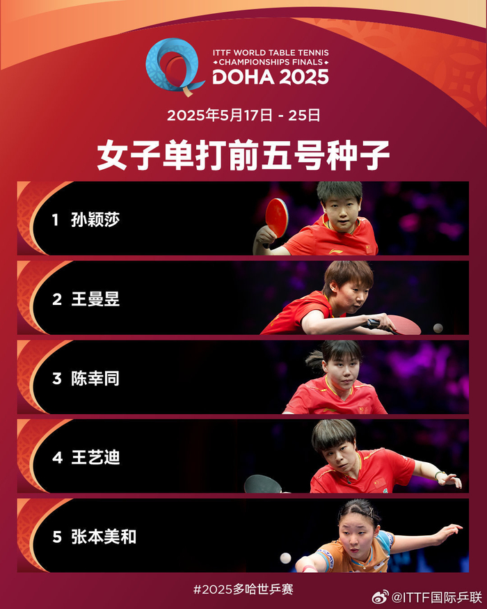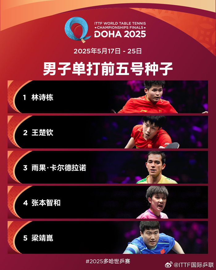 2025多哈世乒赛倒计时10天,@ITTF国际乒联 发布本次比赛男、女单前五号种子,以及他们本赛季截止到目前所取得的成绩。一起来看!