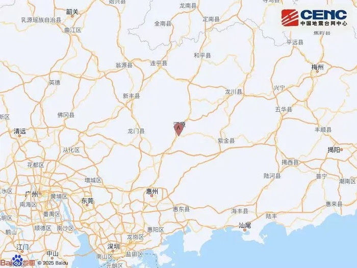 中国地震台网正式测定:05月29日13时17分在广东河源市源城区(北纬23.71度,东经114.69度)发生3.5级地震,震源深度11千米。