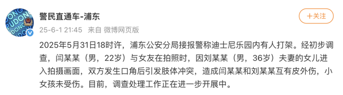 6月1日晚,据@警民直通车-浦东 通报:5月31日18时许,浦东公安分局接报警称迪士尼乐园内有人打架。经初步调查,闫某某(男,22岁)与女友在拍照时,因刘某某(男,36岁)夫妻的女儿进入拍摄画面,双方发生口角后引发肢体冲突,造成闫某某和刘某某互有皮外伤,小女孩未受伤。目前,调查处理工作正在进一步开展中。