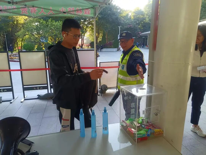 一是严格火源管控。各门岗利用广播提醒游客禁止携带火种进山,在入口显著位置设置防火检查站标识、禁火禁烟警示牌、火种自弃自取箱;主要门岗设安检机对进山人员携带物品进行安检,门岗执勤人员着防火服,持金属探测仪对进山游客进行检查。