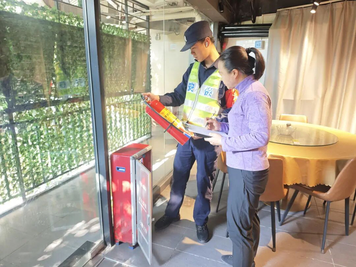 工作人员检查灭火器四是加强巡查检查。各单位对辖区内主干道、二级小路进行防火巡查,及时发现并依法制止违规行为,检查辖区消防设施设备运行情况。对在景区内吸烟、生火的,责令其立即停止违法行为并给予警告;对不予配合或已造成火灾的,依据有关法律、法规进行处理;构成犯罪的,依法追究刑事责任。