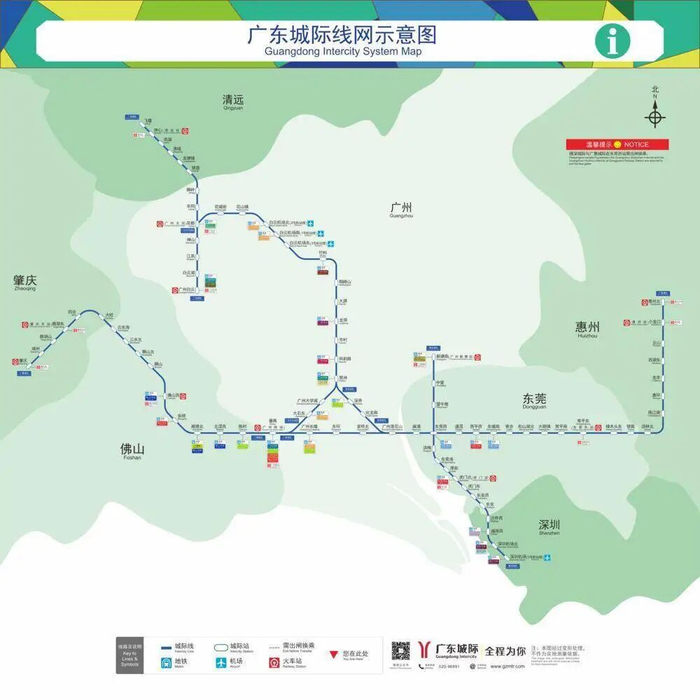 目前,广东城际全天开行5条站站停交路, 7条特快列车、大站快车交路,串联了广州南站、广州白云站、广州北站、佛山西站、东莞西站、惠州北站、肇庆站、肇庆东站、清远站、广州白云机场、深圳宝安机场等交通枢纽。
