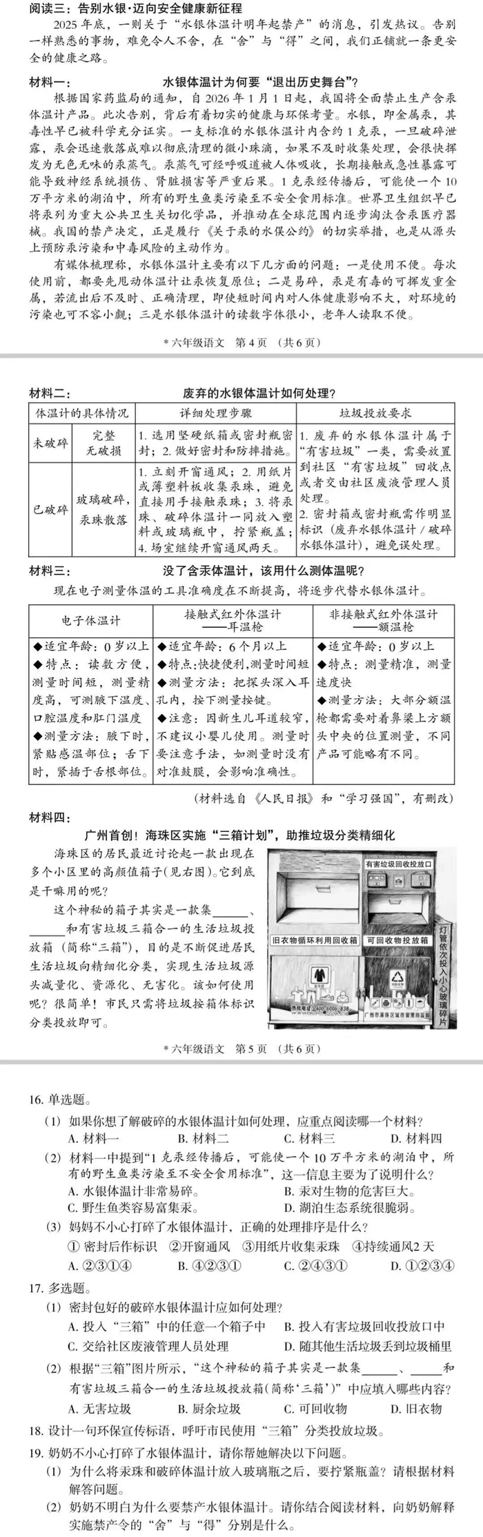 例4:语文卷“阅读三”关于水银体温计的材料题(六年级语文)