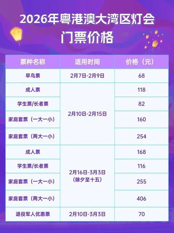 2026年粤港澳大湾区灯会将于2月2日正式启动门票销售。本次灯会试运营期为2月7日至9日,正式运营从2月10日持续至5月10日,地点位于南沙天后宫景区及南沙滨海公园。记者了解到,早鸟票将于2月2日至3日限量发售,价格为68元,每日限量1.3万张,仅限试运营期间使用。