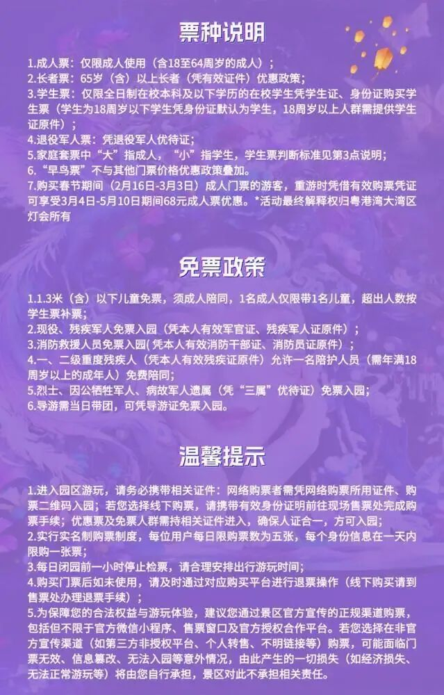 2月4日至3月3日,灯会全票种购票通道将全面开启。官方特别推出重游优惠:凡购买春节期间(2月16日至3月3日)成人票的游客,可凭有效购票凭证,在3月4日至5月10日期间以68元优惠价再次购买成人票。