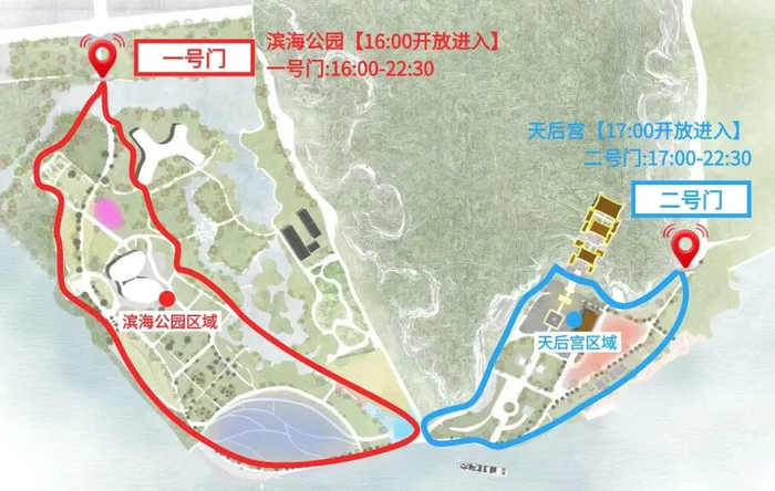 灯会运营期间,滨海公园区域(一号门)开放时间为16:00至22:30,天后宫区域(二号门)开放时间为17:00至22:30。需要注意的是,南沙天后宫景区日间(8:00-16:00)仍正常运营,灯会门票与景区日间门票需分别购买。