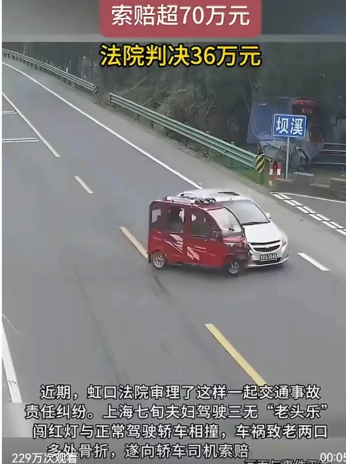 近日,上海一起交通事故判决引发全网热议:七旬夫妇驾驶无牌、无证、无保险的“三无”老头乐闯红灯,与正常绿灯行驶的轿车相撞,老两口多处骨折,其后索赔70余万元,法院最终核定赔偿36万元。