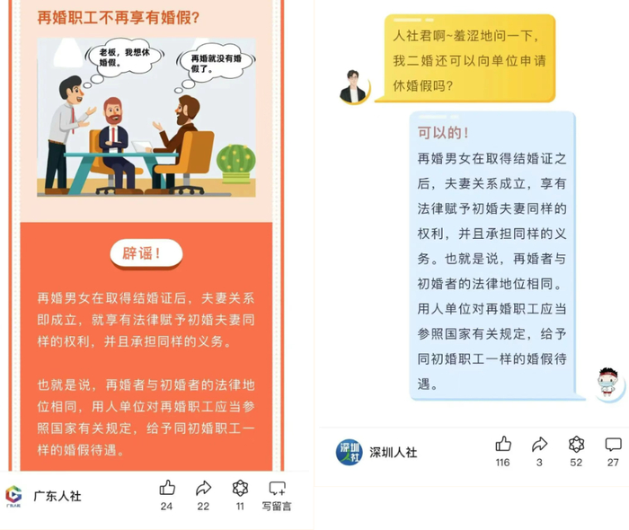 “广东人社”“深圳人社”等官方微信公众号也曾发文表示:再婚享受与初婚一样的待遇