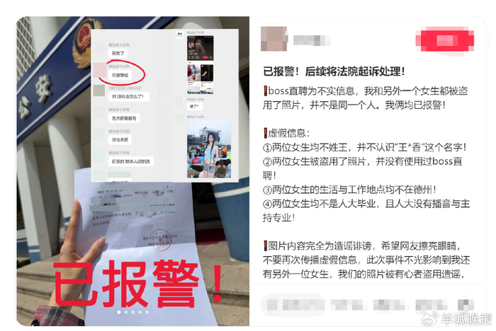 这名网友又通过社交媒体平台发帖称已经报警,并表示“我和另外一名女生都被盗用了照片,并不是同一个人。我俩均已报警”,她进一步解释:“两位女士均不姓王,并不认识‘王某香’这个名字”“两名女生都并没有使用过BOSS直聘”“两位女生的生活与工作地点均不在德州”。