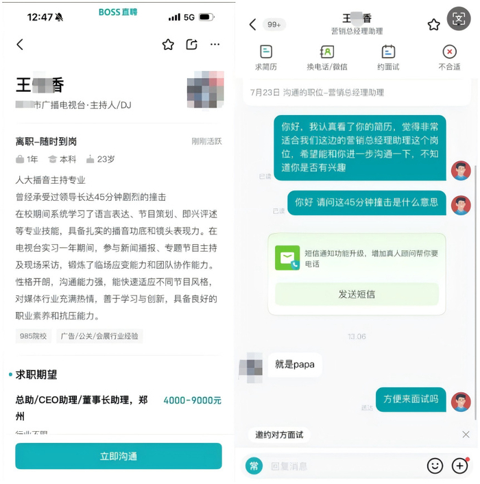 网传截图显示,7月23日,招聘求职类网络平台BOSS直聘用户“王某香”在应聘“董事长助理”时,简历中出现“曾承受领导长达45分钟剧烈撞击”等露骨描述。相关截图在社交媒体热传,引发公众对BOSS直聘存在“色情招聘”的声讨。