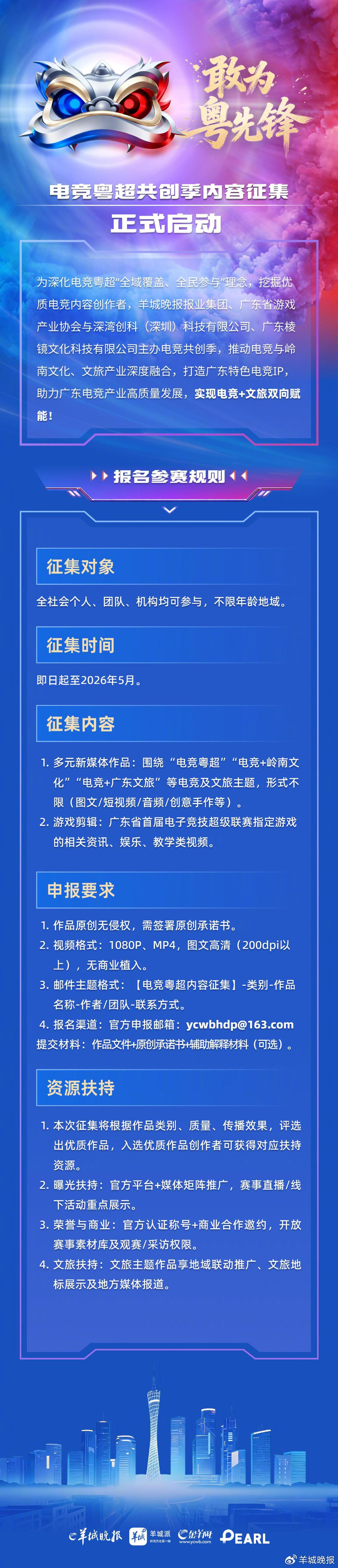 据悉,本次征集面向全社会开放,个人、团队、机构均可参与,不限年龄、不限地域(优先扶持广东本地创作者及聚焦岭南文化的作品),包括但不限于电竞爱好者、内容创作者、自媒体博主、高校学生、电竞俱乐部相关从业者等。