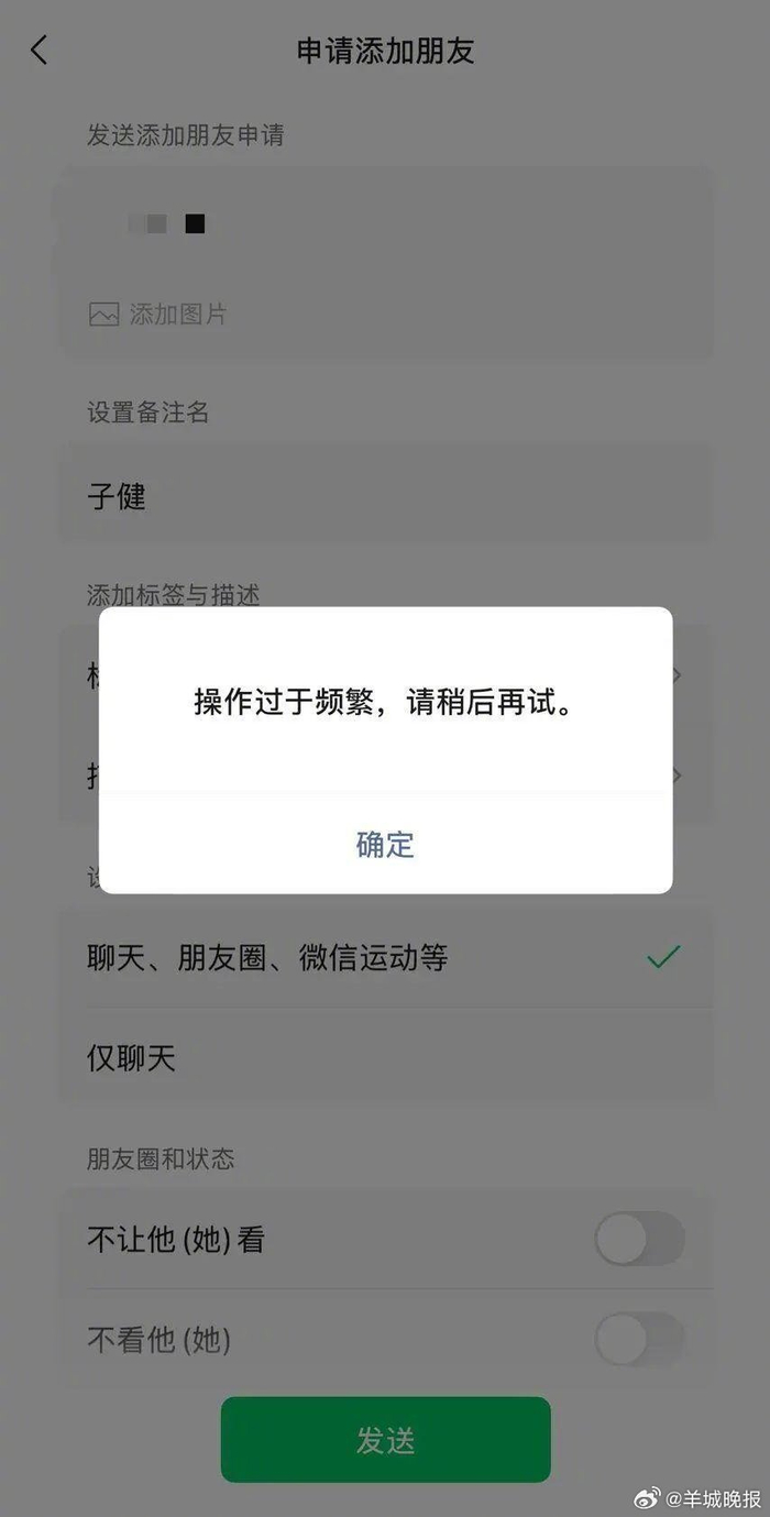 6月1日,记者尝试通过该微信二维码添加该男子好友,但显示“操作过于频繁,请稍后再试”,添加失败。有网友发布的帖子显示,该微信已经无法添加。