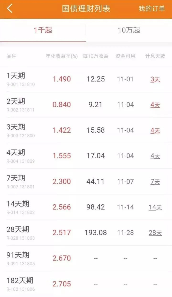 下图是近期不同天数所对应的部分国债逆回购利率,大家也可以在各大券商网站的理财APP上查看。