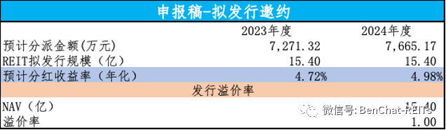 (2)约6亿份基金份额,发行规模约为15.70亿左右。根据发行人发行安排及假设,REIT的NAV为15.4亿,对应的发行溢价率为1.02倍。