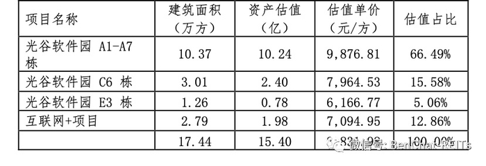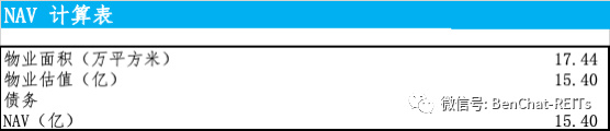物业位置:于武汉市东湖新技术开发区关山大道 1 号的“光谷软件园“项目,以及位于武汉市东湖高新区光谷大道41号“互联网+项目 ”。估值单位:戴德梁行估值时点:2022年12月31日估值对象:武汉光谷REITs底层资产17.44万方评估方法:100%收益法剩余年限:30年折现率:6.50%资本化率(Cap Rate) :2023 年度的资本化率为 5.33%。估值结果:15.40亿评估结果如下表:1、按照REITs交易结构安排,没有做融资杠杆设计,因此债务为0。2、本单REITs底层资产17.44万方,总估值15.4亿元。3、暂不考虑其他因素影响。因此REITs净资产(NAV)=15.40-0=15.40亿。如下表: