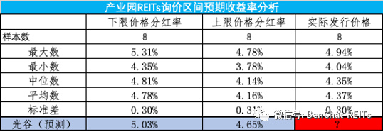 (二)产业园REITs统计分析武汉光谷REIT资产类型为产业园类的新经济、租赁型REITs。截止2023年5月已经发行上市产业类型REIT为8单,总发行规模152亿。8单产业园REITs询价区间分红收益率统计描述如下:1、武行光谷REITs询价价格下限对应的预期分红收益率为5.03%,与最大值5.31%相差约一个标准差,但大于中位数4.81%和平均数4.78%。2、武行光谷REITs询价价格上限对应的预期分红收益率为4.65%,与最大值4.78%相差约0.5个标准差,但大于中位数4.14%和平均数4.16%。3、8单产业园REITs中,实际发行价对应的发行首年度预期分红收益率平均数为基于才聊REITs估值模型及如下信息:(1)已经发行8单REITs询价区间及实际发行价对应的预期分红收益率统计分析;(2)武汉光谷REIT资产类型;(3)发行人声誉;(4)资产区位及资产收益质量;(5)自4月份以来的中国REITs资本市场情况我们预测武行光谷REIT发行价约为2.617元/份额,发行规模约15.70亿,对应首年度预期分红收益率(2024年)约为:4.89%。如下表4.37%。最高为东久REIT(4.94%),最低为张江REIT(4.04%)。4、假设询价区间差价=询价上限价-询价下限价,8单已经发行REIT区间差异最大为临港REIT:0.89%,最小为东久REIT:0.25%。而武汉光谷REIT询价区间差异为0.38%,略高于东久。(见附件:产业园REITs询价区间预期分红收益率对比)根据上述情况武汉光谷REIT的实际发行价预计多少?