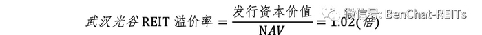 2、发行溢价率预测值(1)根据才聊REITs对武汉光谷REIT发行价值预测,6亿份基金份额,发行规模约为15.70亿左右。(2)根据发行人发行安排及假设,本单REIT的NAV为15.4亿,对应的发行溢价率为1.02倍。则: